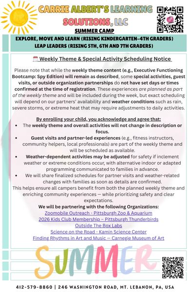 Please note that while the weekly theme content (e.g., Executive Functioning Bootcamp: Spy Edition) will remain as described, some special activities, guest visits, or outside organization partnerships do not have set days or times confirmed at the time of registration. These experiences are planned as part of the weekly theme and will be included during the week, but exact scheduling will depend on our partners’ availability and weather conditions such as rain, severe storms, or extreme heat that may require adjustments to daily activities.