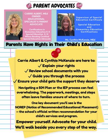 We offer comprehensive Parent Advocate Services to support families in navigating educational systems and securing the appropriate services for their children. These services can be provided collaboratively or individually by either Carrie Albert, MEd or Cynthia McKenzie, MEd depending on the needs of th