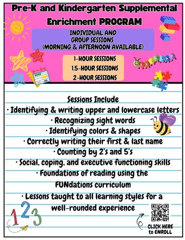 Our Little Learners Program is designed for Pre-K, upcoming, and current Kindergarten students. It complements the upcoming & current Kindergarten curriculum, helping children build key academic, social, & executive functioning skill