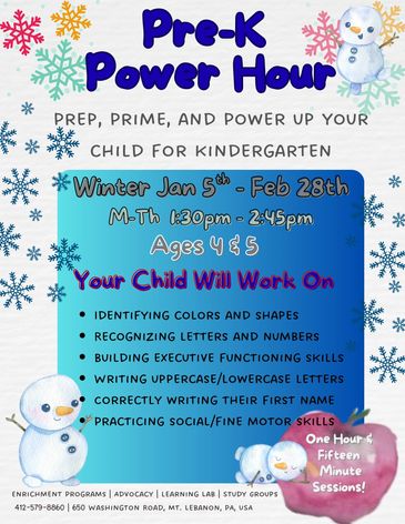 Our 1 hour and 15 minute Pre-K Power Hour is designed to give young learners a fun, engaging, and developmentally appropriate boost as they prepare for kindergarten. Through hands-on activities, playful learning, and structured support, children will build foundational academic and social skills t