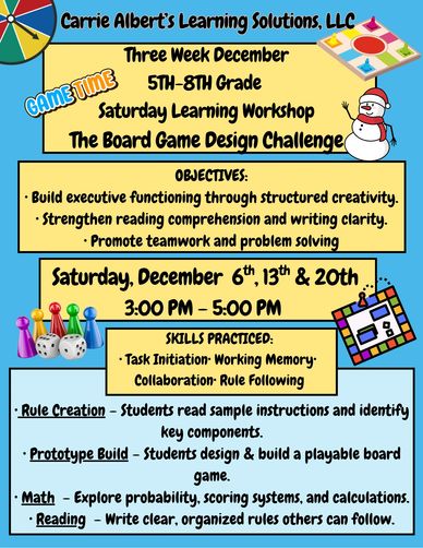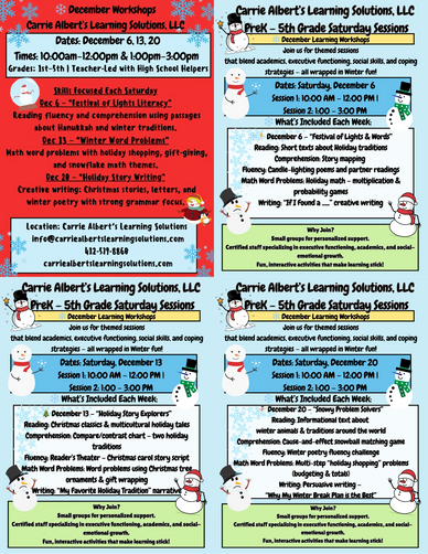 December brings holiday-themed learning inspired by traditions, with a focus on reading, writing, math, and problem-solving. Students will also practice organization, attention, and coping strategies through creative projects that encourage respect, community, and celebration of differences.